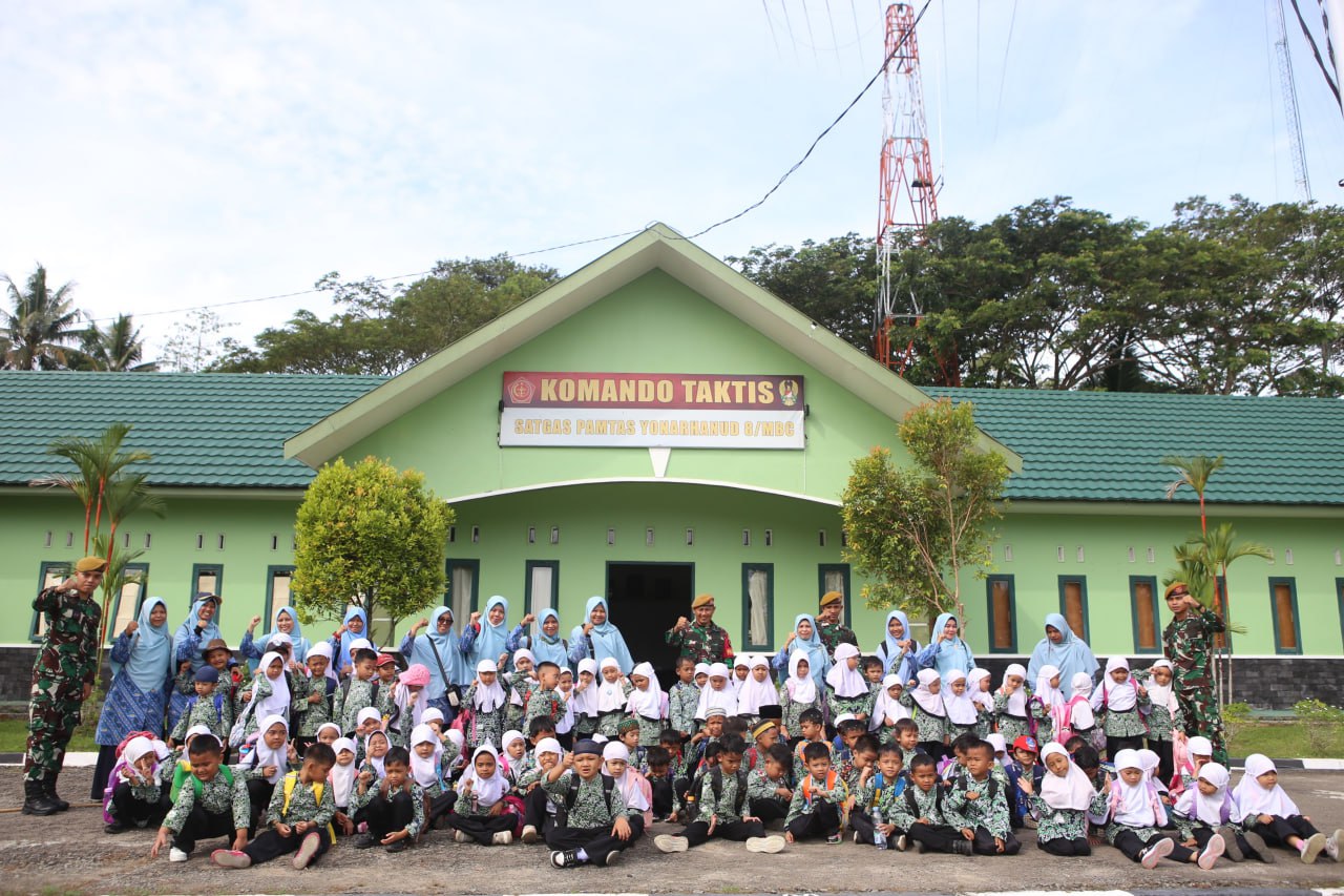 Kunjungan anak-anak yang didampingi pihak sekolah itu, mendapat sambutan hangat dari seluruh personel Satgas.